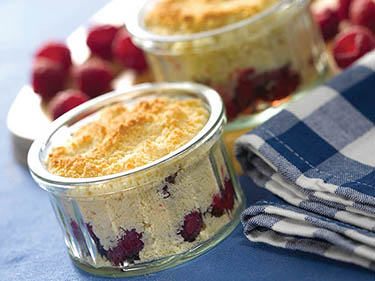 - Place raspberries in a small ovenproof dish and cover with crumble topping